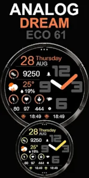 Analog Dream ECO61 is een innovatieve analoge wijzerplaat voor Wear OS-smartwatches, ontworpen om uitgebreide gezondheids- en fitnessinformatie te bieden. Met functies zoals hartslagmeting, stappenteller en calorieverbranding, is deze wijzerplaat ideaal voor gebruikers die hun dagelijkse activiteiten willen bijhouden. De wijzerplaat toont ook de huidige temperatuur, neerslagpercentage en heeft de mogelijkheid om meldingen weer te geven, waardoor het een veelzijdige keuze is voor elke smartwatch-gebruiker.